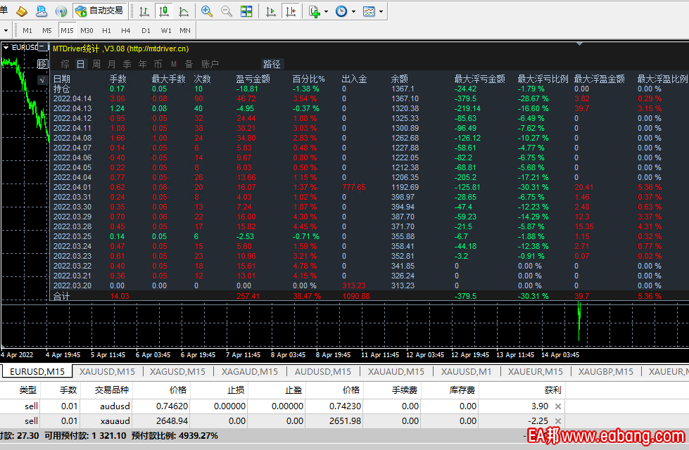 最后,回到主题,希望小资金做外汇的兄弟们提起信心、小资金也能有用武之地,只要肯用心研究,总会找到一套属于自己的小资金盈利方法,EA邦是学习外汇很好的平台,没有哪个网站或个人能像EA邦老师在论坛里这样教大家去看懂原理和有问必答的,我也是在2020年初疫情关家里时有幸网上找到EA邦的,期间向老师们提过很多问题、都得到解答和学习,从那时到现在边学边实践提升的很快,作为受益者这里还是要再次感谢EA邦老师们的辛勤付出。