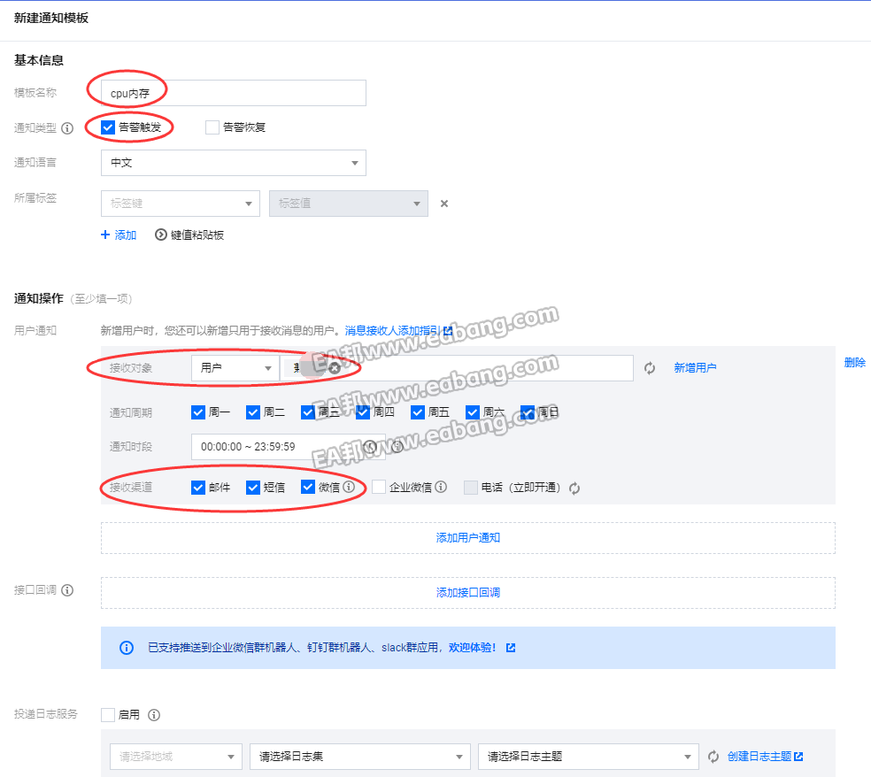 我选择的是“告警触发”通知,告警恢复通知我没有勾选,你可以按你的情况决定是否勾选。