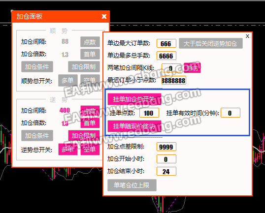 现在的挂单加仓只有逆势加仓中有,并且还只有stop方式的挂单,也就是突破单。