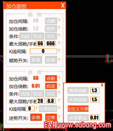 给你单独生成了一个版本,这个版本的加仓的末单累加右边的输入框跟自动面板上面的单量的计算出的值是一致的,也就是说你的自动面板的首单怎么设置,这个末单累加就是怎么设置,这个输入框跟自动面板的开仓量计算有关,手动输入无效。