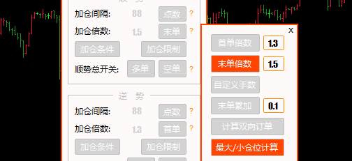 最大/小仓位计算:下笔加仓的仓位计算,首单以最轻仓位进场,末单以最重的仓位进行计算。