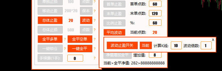 平均波动:如上图,在当前里面选择相应的周期,计算前10根K线的平均波动值*波动倍数=止盈点数值,当单向订单达到止盈点数时离场;