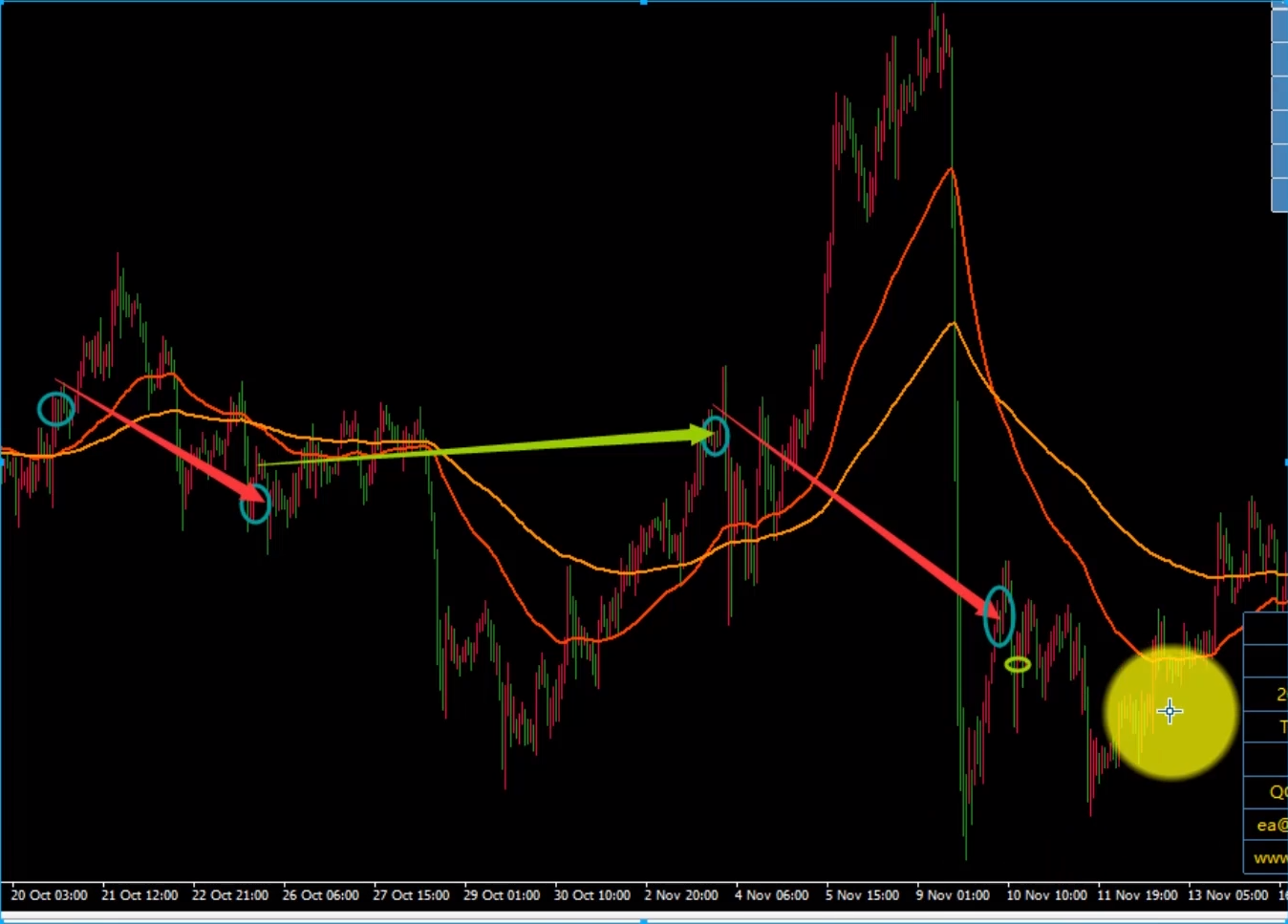 像之前的这种无效的交叉,在这些交叉里面来做单的话一定赚不到钱,想要抓住能赚钱的一波均线交易,比如说死叉的时候有两条均线,一个是短均线一个是长均线,短均线红色的55,长均线黄色的144,当短均线下穿长均线咱们做空,上穿做多,死叉就不平多做空,最后在将所有的多空订单和之前的亏损 一起出厂。这种交易方法的好处是什么呢,比如说我们把之后的行情盖住,我不知道后面的行情会怎么走,但是我知道它将会有一个趋势行情,因为均线有一个特点就是均线横盘时间长了,比如说几波均线都不赚钱,那么就会有一波大的能够赚钱的行情出现,行情都是这样,横盘久了就会突破,要么做多要么做空,具体的就可以用这种方法来抓这种大的行情。