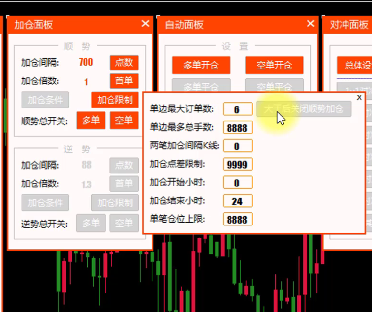 顺势加仓:加仓间隔700点,加仓倍数1倍,最大加仓6单。